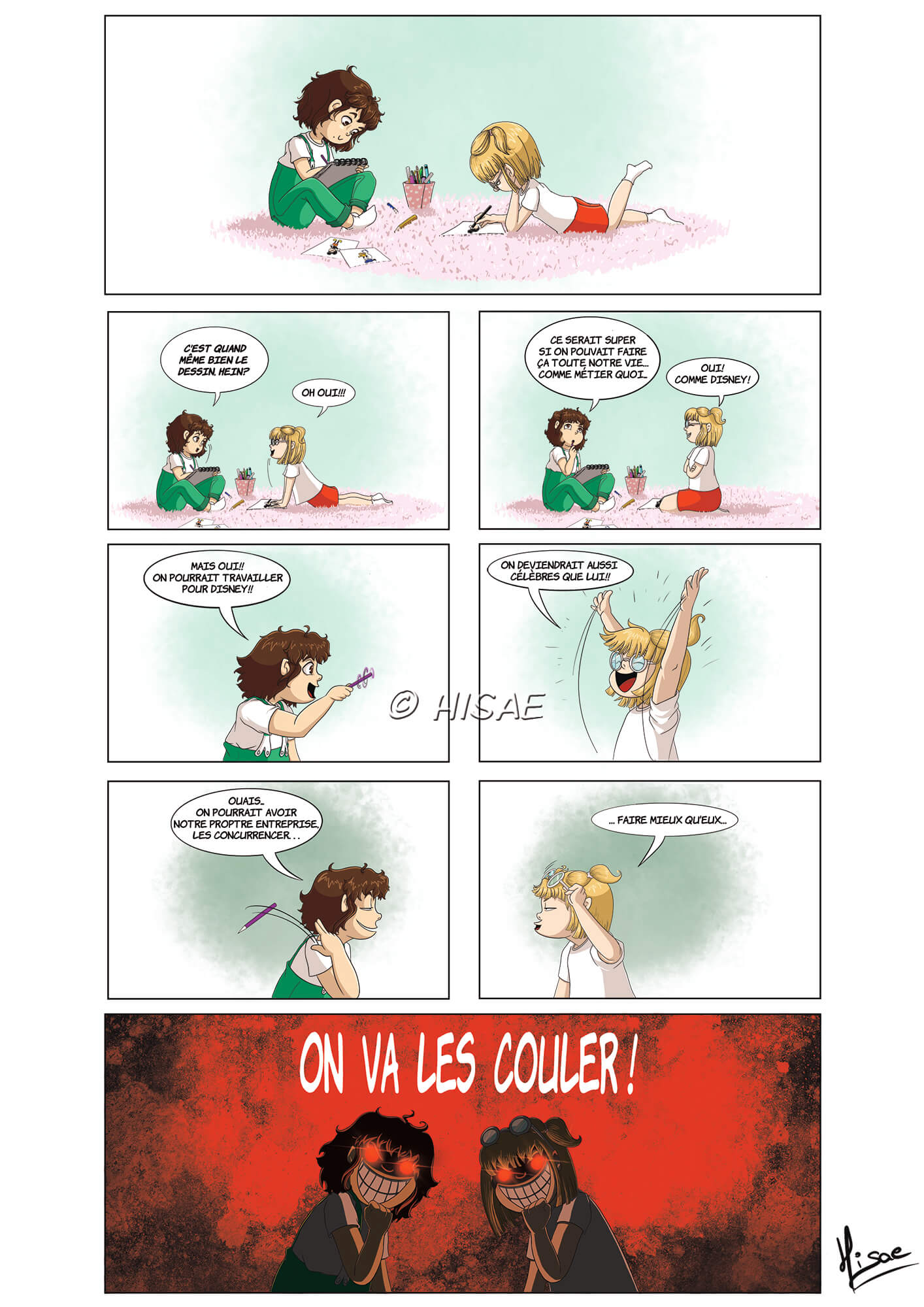 Adepte des dessins uniques, je développe par ailleurs de plus en plus des histoires courtes scénarisées, à tendance humoristique. Le quotidien