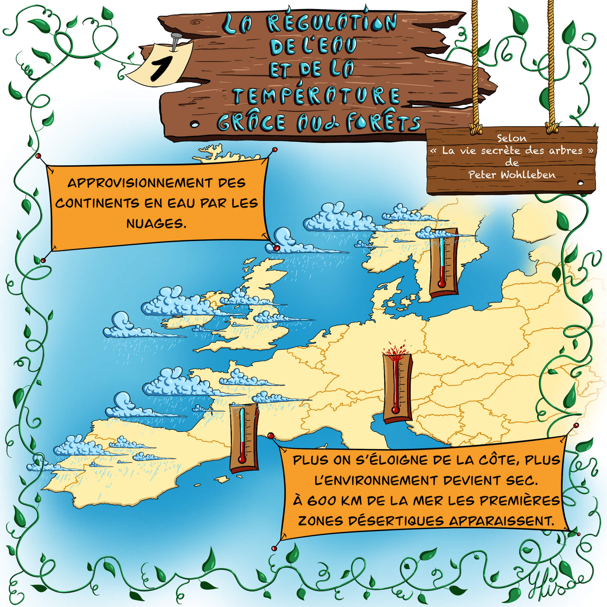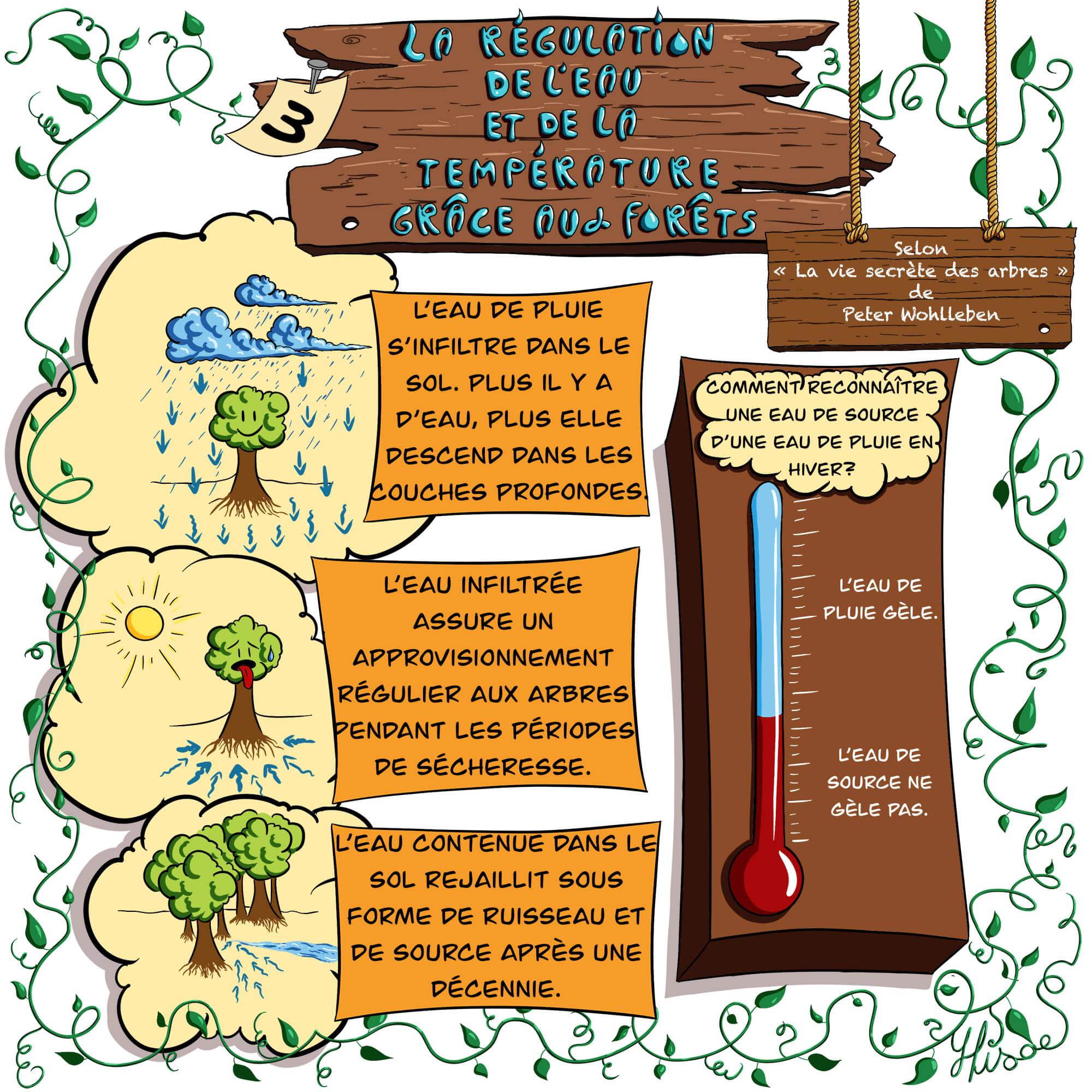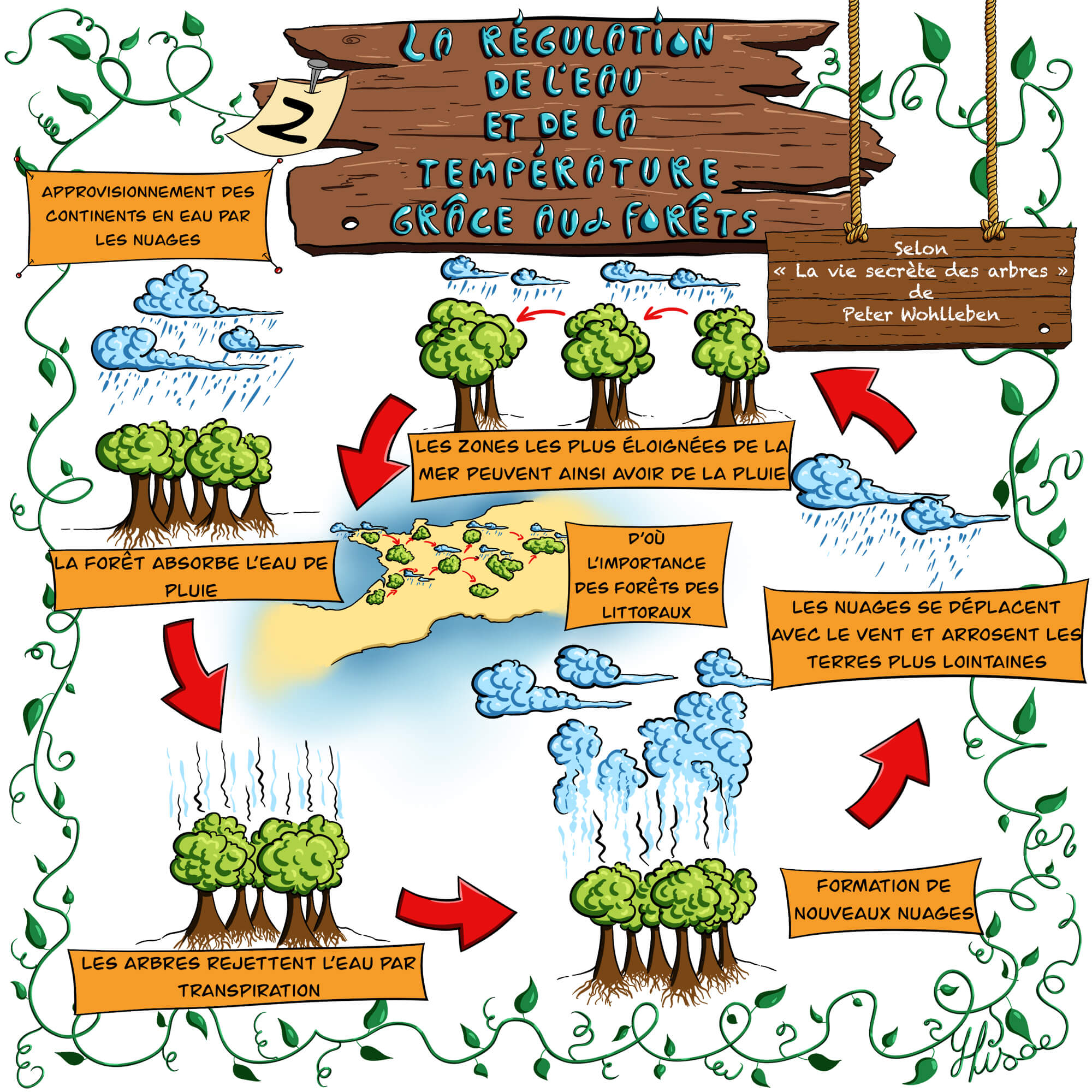Son ouvrage entier mériterait d’être transposé via la facilitation graphique tellement le message qu’il porte est instructif et indispensable dans le monde qui est le nôtre. A défaut, j’ai réalisé ces trois visuels numériques, issus de l’un des chapitres de son livre, qui montrent l’importance de la forêt pour l’apport en eau et surtout pour la régulation de la température.